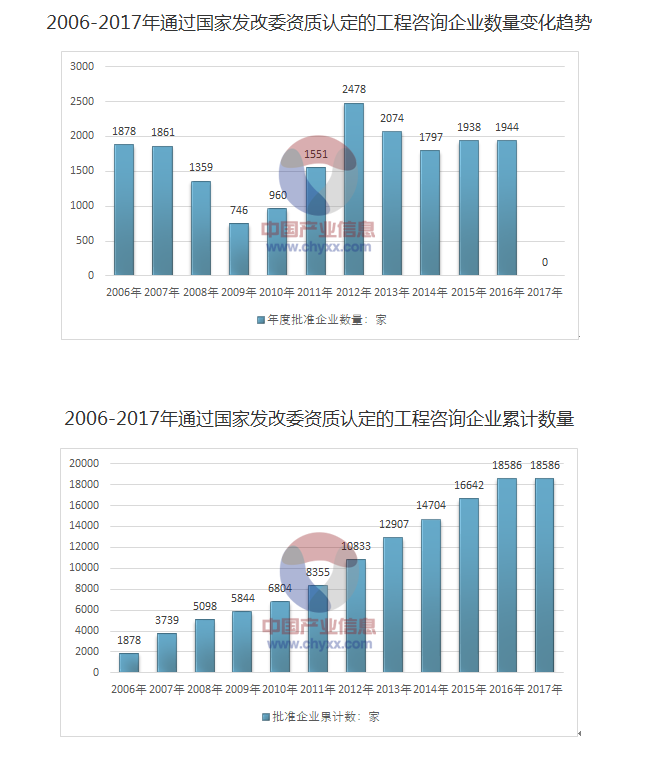 2006年開(kāi)始,國(guó)家發(fā)改委開(kāi)展工程咨詢單位資格認(rèn)定工作。2005年之前發(fā)改委原頒發(fā)的臨時(shí)級(jí)、預(yù)備級(jí)、丙級(jí)工程咨詢資格證書(shū)有效期截止至2005年12月31日,需要重新申請(qǐng)工程咨詢資格。持有正式甲、乙級(jí)工程咨詢資格證書(shū)的單位,2006年另行申請(qǐng)工程咨詢資格。因此此處統(tǒng)計(jì)口徑主要是2006年以來(lái)通過(guò)國(guó)家發(fā)...